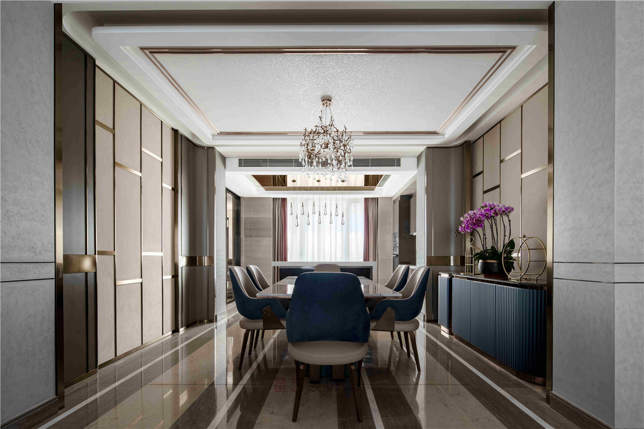 用餐區(qū)則把輕奢主義發(fā)揮到及至,首先就是金屬質(zhì)感的鑲嵌紋理,和富麗堂皇的水晶燈,都是業(yè)主最愛的元素之一,為即將入住的新婚夫妻帶來滿滿的浪漫氣息。