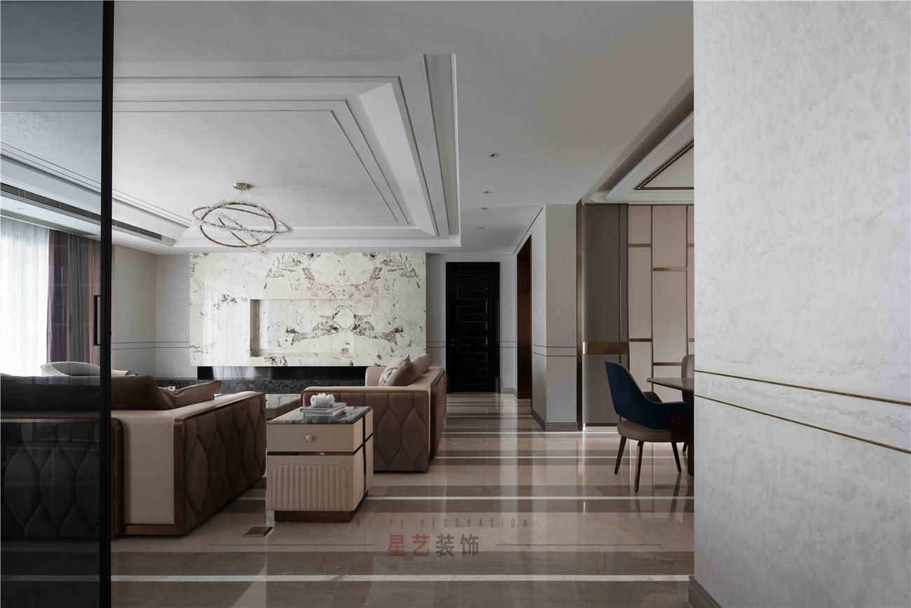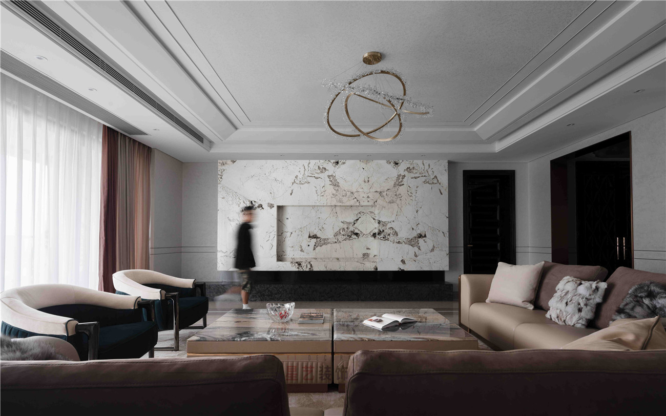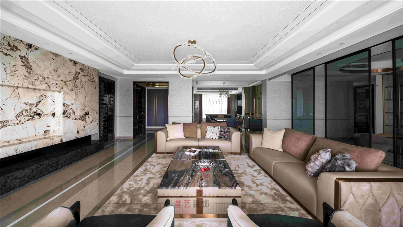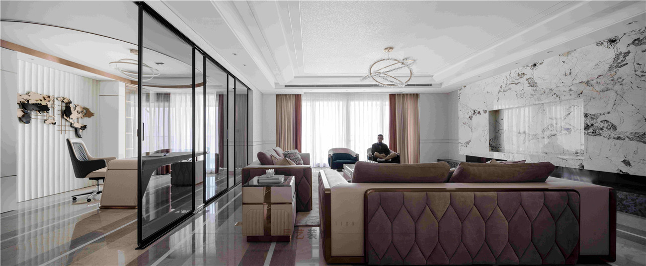 本案設計是位于海珠區(qū)380㎡的住宅,擁有無敵景觀一視野,業(yè)主90后,準備做婚房,要求輕奢,鐘愛石材,金屬和皮質(zhì)的家居風格,敞開式書房通過隔斷可移動屏風于客戶區(qū)域串聯(lián)起來,可開可隔斷的靈動組合,最大的強化空間包容及開闊性,用中西結合的方式為即將到來的婚姻生活帶來更高的幸福指數(shù),打造溫馨的生活環(huán)境。