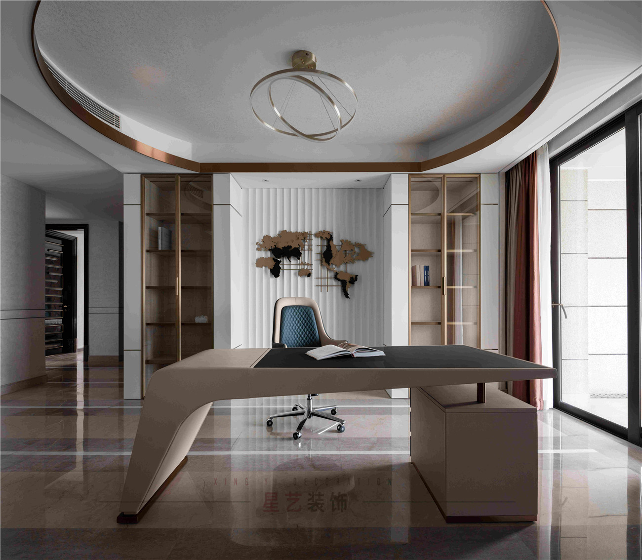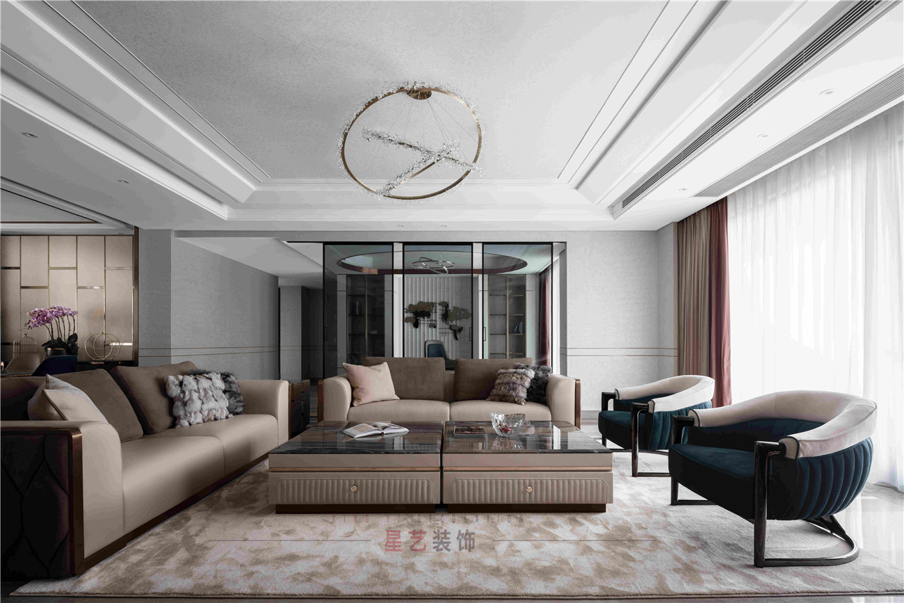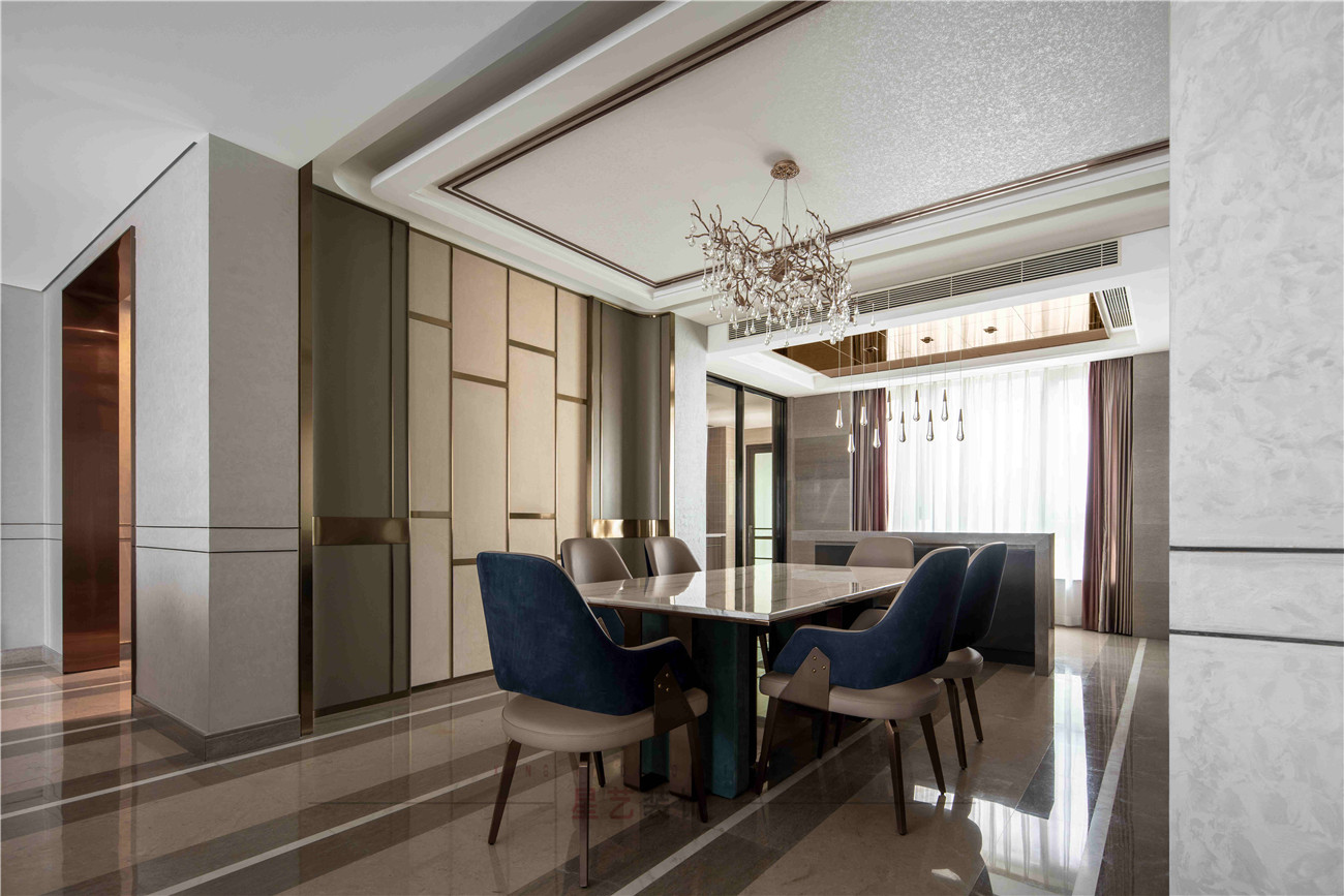 本案設計是位于海珠區(qū)380㎡的住宅,擁有無敵景觀一視野,業(yè)主90后,準備做婚房,要求輕奢,鐘愛石材,金屬和皮質(zhì)的家居風格,敞開式書房通過隔斷可移動屏風于客戶區(qū)域串聯(lián)起來,可開可隔斷的靈動組合,最大的強化空間包容及開闊性,用中西結合的方式為即將到來的婚姻生活帶來更高的幸福指數(shù),打造溫馨的生活環(huán)境。